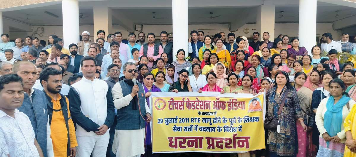 शिक्षकों का कहना था कि 1 सितंबर 2025 को सर्वोच्च न्यायालय ने केन्द्र सरकार के 2017 के शासनादेश के क्रम में सेवारत शिक्षकों के लिए भी टीईटी उत्तीर्ण करना अनिवार्य कर दिया है, जबकि सभी शिक्षक नियुक्ति के समय निर्धारित मानकों को पूरा कर ही सेवा में आए थे। सरकार का यह निर्णय न केवल अन्यायपूर्ण है बल्कि लाखों परिवारों के भविष्य पर संकट खड़ा हो गया है। धरने को संबोधित करते हुए उत्तर प्रदेशीय प्राथमिक शिक्षक संघ के जिलाध्यक्ष चन्द्रिका सिंह ने कहा कि शिक्षकों के ऊपर जबरन टीईटी अनिवार्यता की जा रही है। शिक्षकों ने नियुक्ति के सभी सभी मानक पूर्ण किये थे उस समय सभी परीक्षा पास की थी लेकिन आज सरकार की गलत नीतियों के कारण शिक्षक आज हाशिये पर है। कहा कि शिक्षकों के सम्मान की लड़ाई जिले से लेकर दिल्ली तक लड़ी जाएगी। जूनियर शिक्षक संघ के जिलाध्यक्ष विष्णु दत्त शुक्ल ने कहा कि यह संकट का समय है और इस संकट के समय में हम सभी को एकजुट होकर इस काले कानून के खिलाफ लड़ाई लड़नी है। जिलामंत्री बालकृष्ण ओझा, जिला कोषाध्यक्ष दुर्गेश यादव, रवीश मिश्र ने कहा कि सरकार की उदासीनता को देखते हुए शिक्षकों ने दिल्ली में विशाल धरने को लेकर रणनीति बनाई है और आने वाले समय मे शिक्षक अब रामलीला मैदान में पहुँचकर सरकार की गलत नीतियों का विरोध करेंगे। धरने को शिव रतन, उमाकांत शुक्ल, राजकुमार तिवारी, अविनाश दूबे, राजेश गिरी, अशोक यादव, विवेक कान्त पाण्डेय, सनद पटेल, अटल उपाध्याय, प्रमोद सिंह, बब्बन पाण्डेय, रामसागर वर्मा, विवेक सिंह, सन्तोष पाण्डेय, हरिओम यादव, अखिलेश पाण्डेय, बृजेश त्रिपाठी, हरेंद्र यादव, सत्य प्रकाश, राम प्यारे, सनद पटेल, विजय यादव, अनीश, सुधीर तिवारी, शिव प्रकाश सिंह, सुरेश गौड़, प्रवीण श्रीवास्तव, अनिल पाठक, सीनियर शिक्षक संघ के प्रदेश अध्य्क्ष श्रवण सिंह, जिलाध्यक्ष शिवशंकर पाण्डेय, सेवानिवृत्त शिक्षक संघ के जिलाध्यक्ष उदय भान दूबे, शिक्षामित्र संघ के जिलाध्यक्ष वीरेन्द्र कुमार शुक्ल आदि ने संबोधित किया। वक्ताओं ने कहा कि शिक्षकों के सम्मान और उनकी रोजी-रोटी की सुरक्षा के लिए पूरा शिक्षक समाज एकजुट है। शिक्षकों को अगर टीईटी से मुक्ति नही मिली तो सरकार को बदलने की भी तैयारी शिक्षक और उनका परिवार करेगा। धरने का संचालन समीउल्लाह अंसारी ने किया। धरने और पैदल मार्च में मुख्य रूप से कंचनमाला त्रिपाठी, रीता सिंह, रंजन सिंह, दिनेश सिंह, नीलू द्विवेदी, विनीता त्रिपाठी, मंगला मौर्य, रजनीश यादव, रुकुनुद्दीन, कुसुम कुमारी, गीता सिंह, चंद्र द्विवेदी, चंद्रमोहन, पवन यादव, राम रंग, फौजिया सिद्दीकी, चन्दना सिंह, सुनीता चौधरी, दुर्गेंद्र सिंह, पुष्पेंद्र कुमार, धीरज सिंह, देवेंद्र चौधरी, हरिश्चंद्र चौधरी, गौरव चौ